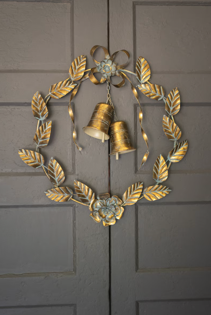 Antique brass leaves make up this Christmas door wreath with bells in the middle. Hang this beauty on your front door or guests' quarters for a festive holiday addition. This piece shines against neutral or colorful backdrops.