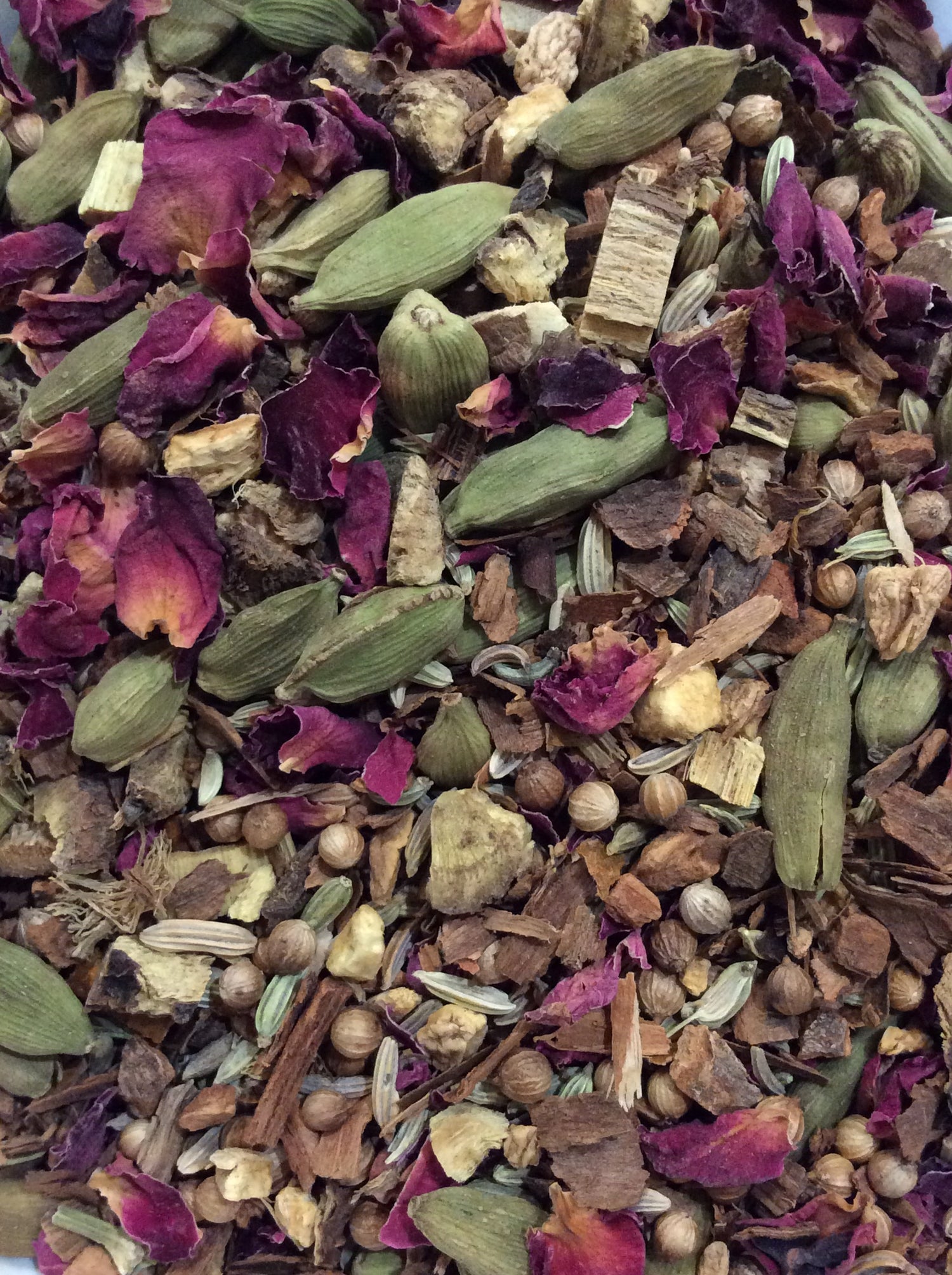 Ayurvedic cinnamon, cardamom, licorice root, coriander, fennel, ginger root, rose.