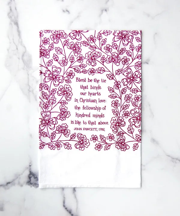 These hymn tea towels are the workhorse of any kitchen. Use for drying hands and dishes, cleaning up spills, wiping countertops, lining baskets, or brightening up your home with color and song. Hang on the oven, or frame and display on the wall. The Blest Be the Tie That Binds hymn tea towel is printed in midnight magenta and features lyrics from the hymn. Made of 100% cotton, these flour sack tea towels easily and cost-effectively replace disposable paper towels with high absorbency and durability. Generously sized, lint free, and made to last a lifetime. Illustrated by Kate Whitley.