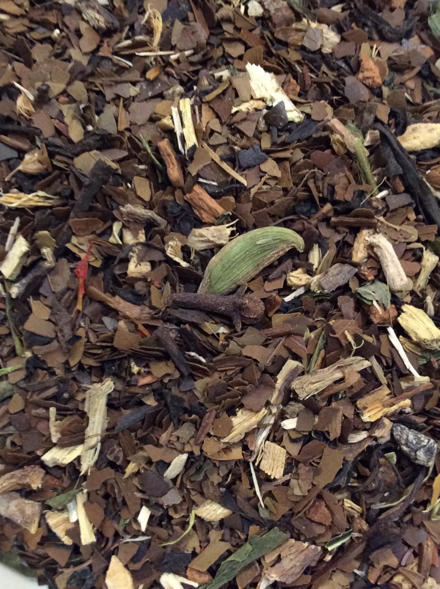 Ingredients: roasted yerba mate, black tea, green tea, white tea, pu'erh, ginger root, cinnamon, cardamom, licorice root, eleuthero ginseng root, saffron, black pepper, clove, fennel, safflowers, peppermint, tulsi, vanilla flavoring