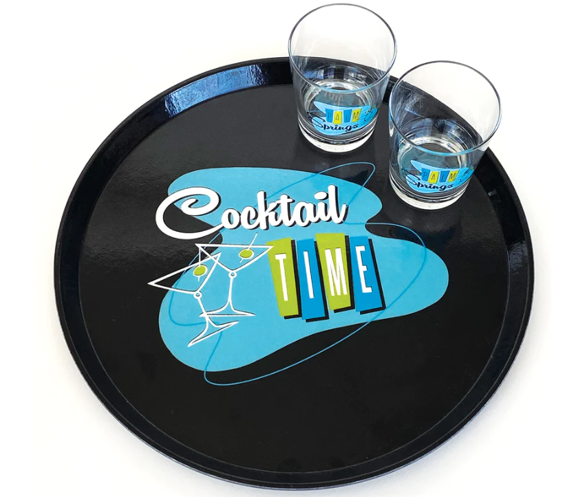 Original Cocktail Time Tray featuring Destination PSP's original midcentury-inspired design. Perfect for the modernist cocktail bar! Measures 16 inches in diameter.