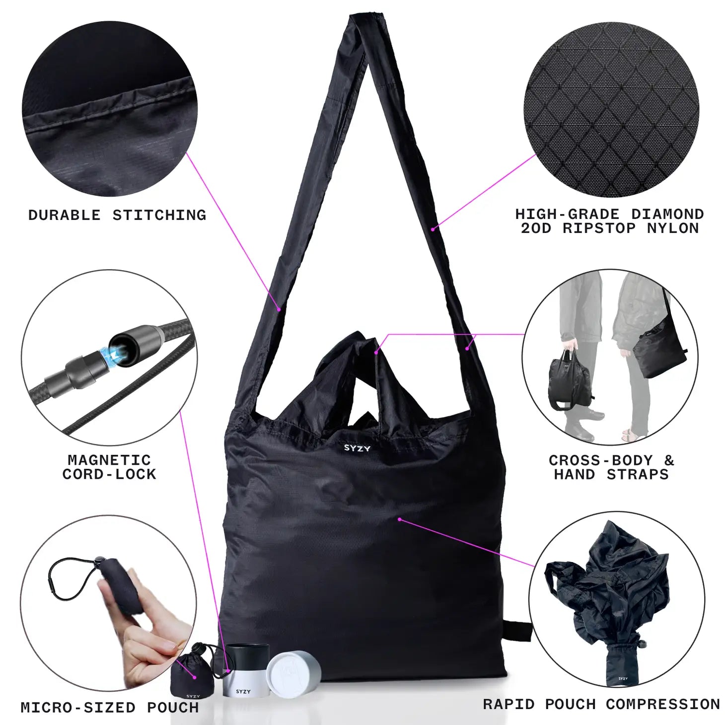 • Easily compacts in seconds into a micro-size pouch, fitting seamlessly in pocket or in purse/bag/backpack without the need to fold