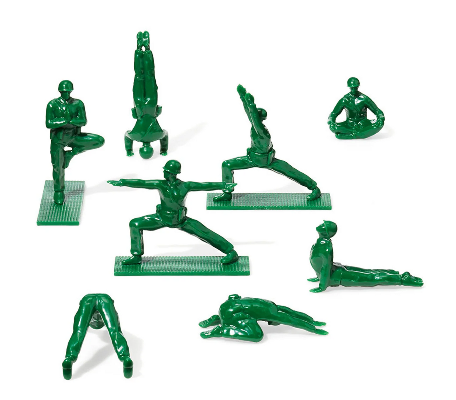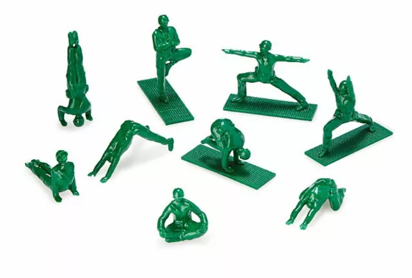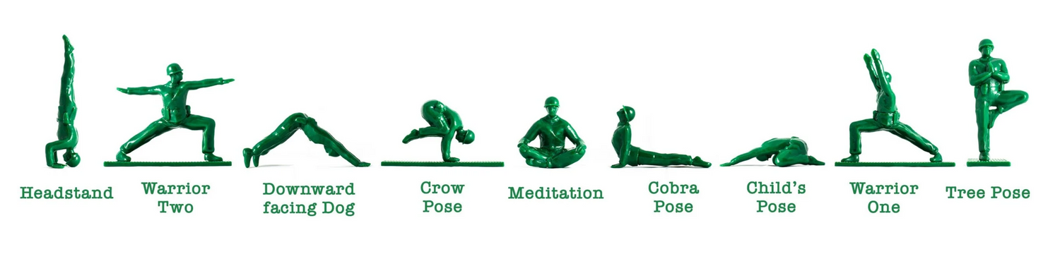 Green army men toys, holding yoga poses instead of guns. Yoga soldiers in Headstand, Meditation Pose, Cobra Pose, Warrior One, Warrior Two, Child's Pose, Tree Pose, Crow Pose, and Downward-facing Dog. Figures vary from 1"-3" high, made from ABS plastic, and come in zen yoga studio packaging with a bamboo floor.