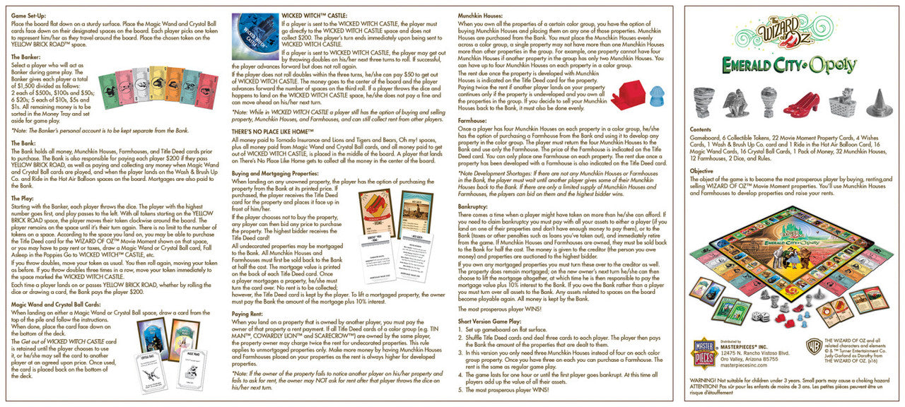 Make your way along the Yellow Brick Road to an Emerald City adventure! Collect your favorite characters along way, including Scarecrow, Tin Man, Cowardly Lion, and many others. Avoid the castle of the Wicked Witch and her field of poppies, then get ready to meet the famous Wizard of Oz and discover There's No Place Like Home! Relive the magic of The Wizard of Oz adventure with this gameboard featuring the characters and places of the movie. Enjoy trivia, movie moments, and character quotes on the back of each property card. Six metal playing pieces include Toto in a basket, a flying monkey, red ruby slippers, and 3 more. Includes: Game Board, 6 Collectible Metal Tokens, 22 Movie Property Cards, 4 Wishes Cards, 1 Wash & Brush Up Co. Card, 1 Ride in the Hot Air Balloon Card, 16 Magic Wand Cards, 16 Crystal Ball Cards, 1 Pack of Custom Money, 32 Plastic Munchkin Home markers, 12 Plastic Farmhouse markers, 2 Dice, and Rules For 2-6 players, ages 8+.