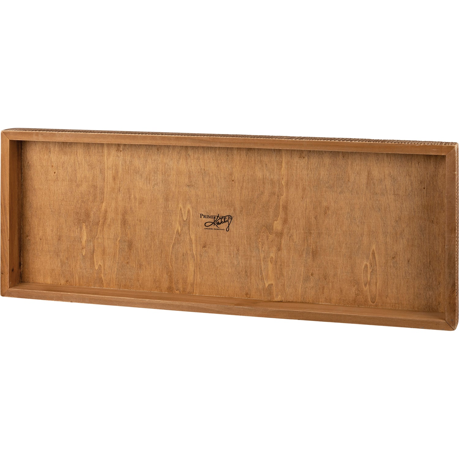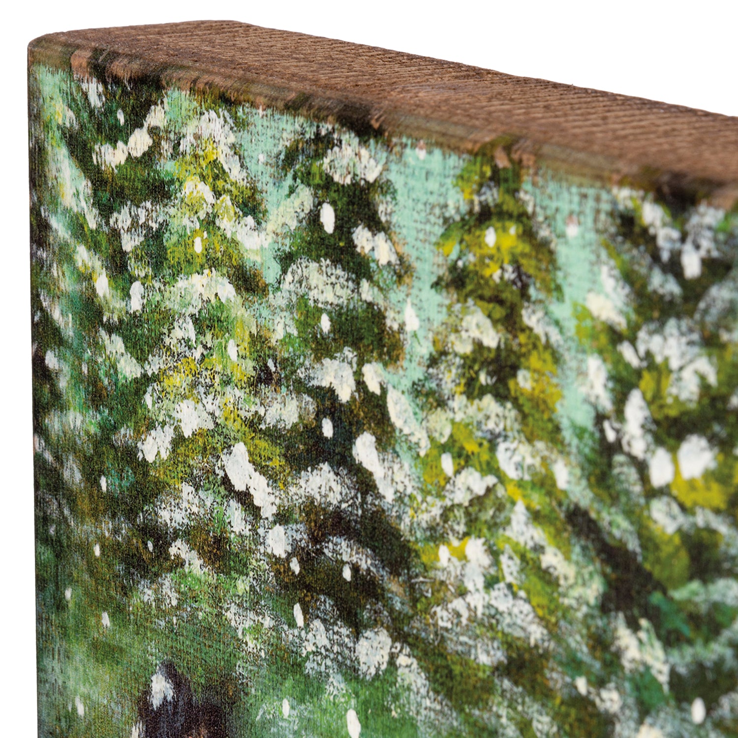 A wooden box sign depicting a donkey and a sheep walking in a snowy landscape with evergreen trees as a backdrop. Design is replicated from original artwork painted onto burlap canvas, giving the art a unique depth and texture. Easy to hang or can free-stand alone.