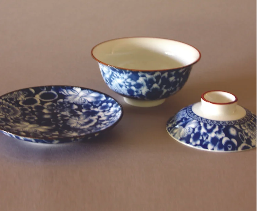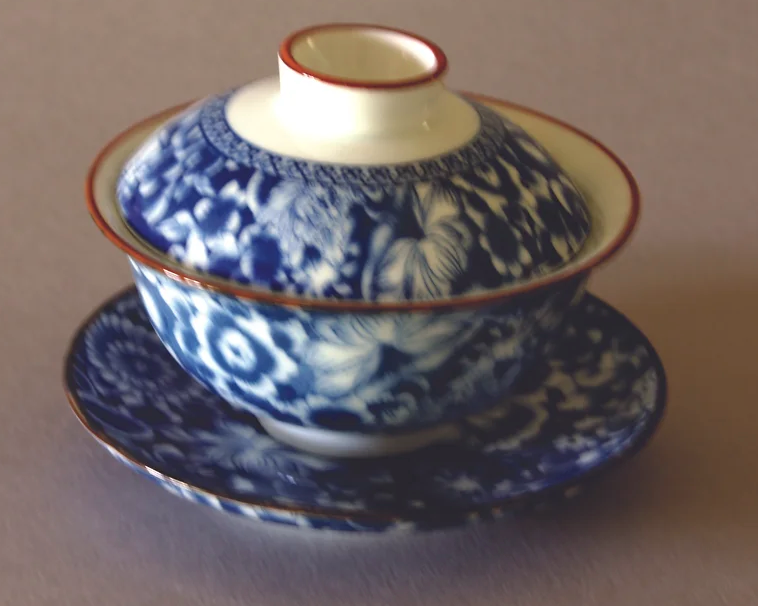 Coral Gaiwan, 2 Cups and Saucer. Stripes