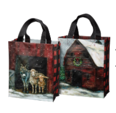 Made of post-consumer material, this daily tote lends a front replication of a painting depicting a donkey, sheep, and goat huddled in a red barn on a snowy day. The back features a replication of a painting depicting the red barn on a snowy day. Original paintings were rendered onto burlap canvas, creating unique texture and depth to design.