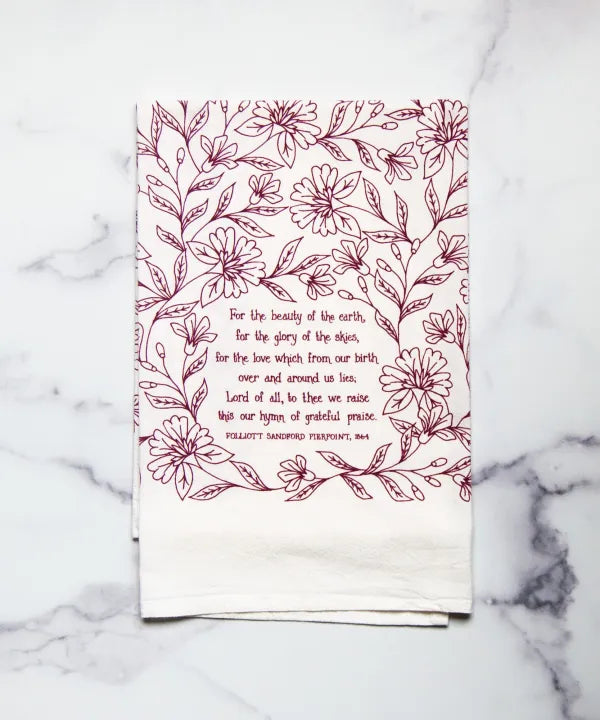 These hymn tea towels are the workhorse of any kitchen. Use for drying hands and dishes, cleaning up spills, wiping countertops, lining baskets, or brightening up your home with color and song. Hang on the oven, or frame and display on the wall. The For the Beauty hymn tea towel is printed in pink plum and features lyrics from the hymn. Made of 100% cotton, these flour sack tea towels easily and cost-effectively replace disposable paper towels with high absorbency and durability. Generously sized, lint free, and made to last a lifetime. Illustrated by Kate Whitley.