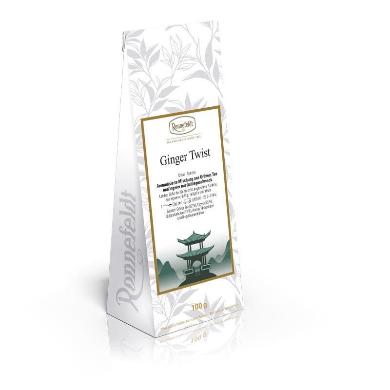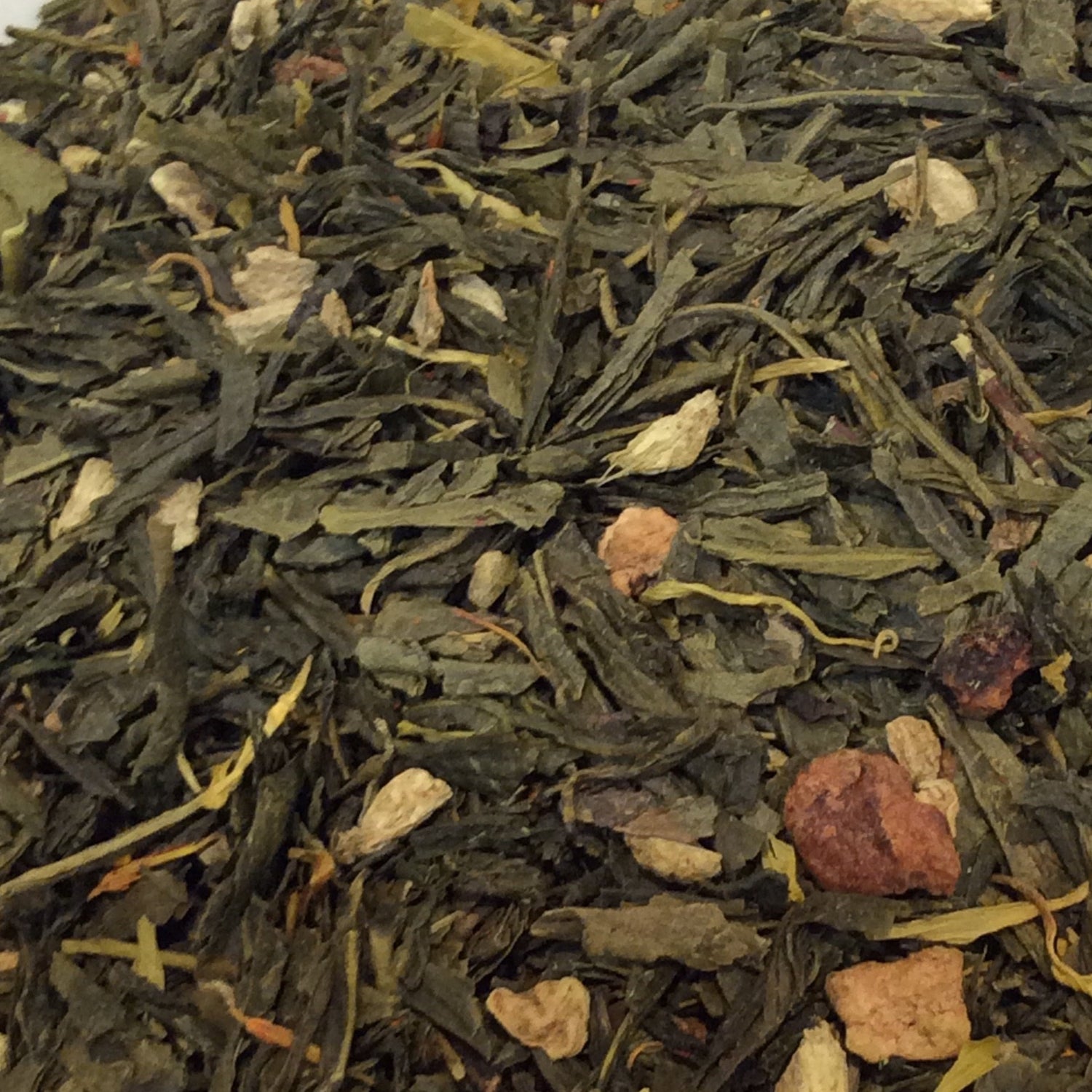 Flavored blend of green tea and ginger with a ginger quince flavor