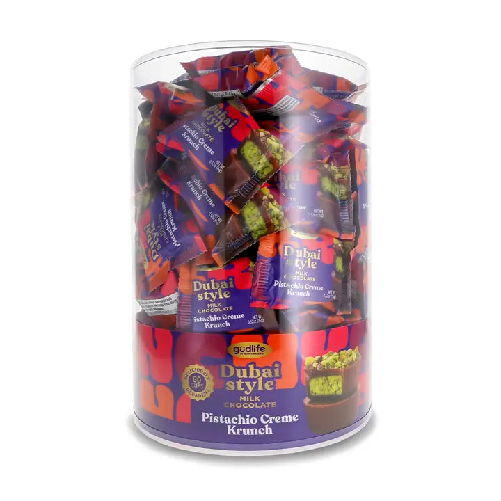 Our Gudlife Dubai Style Milk Chocolate Pistachio Creme Cups are a delicious treat! Milk chocolate is paired with pistachio cream for the ultimate delight!
