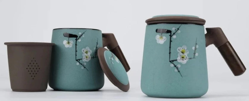 Wood-Handle Purple Clay Tea Mug w/ Strainer Hand painted