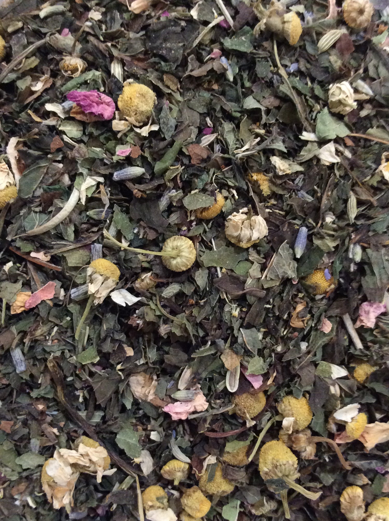 A blend of chamomile,peppermint,lemon balm,strawberry leaves fennel seeds,orange flowers,nettle leaves,lavender,rose petals