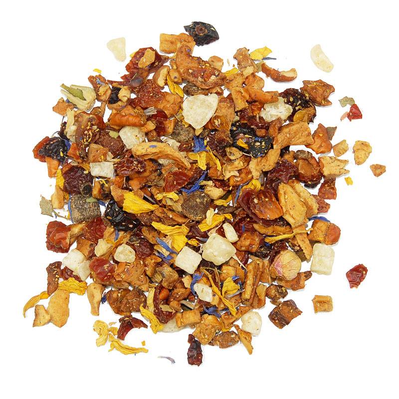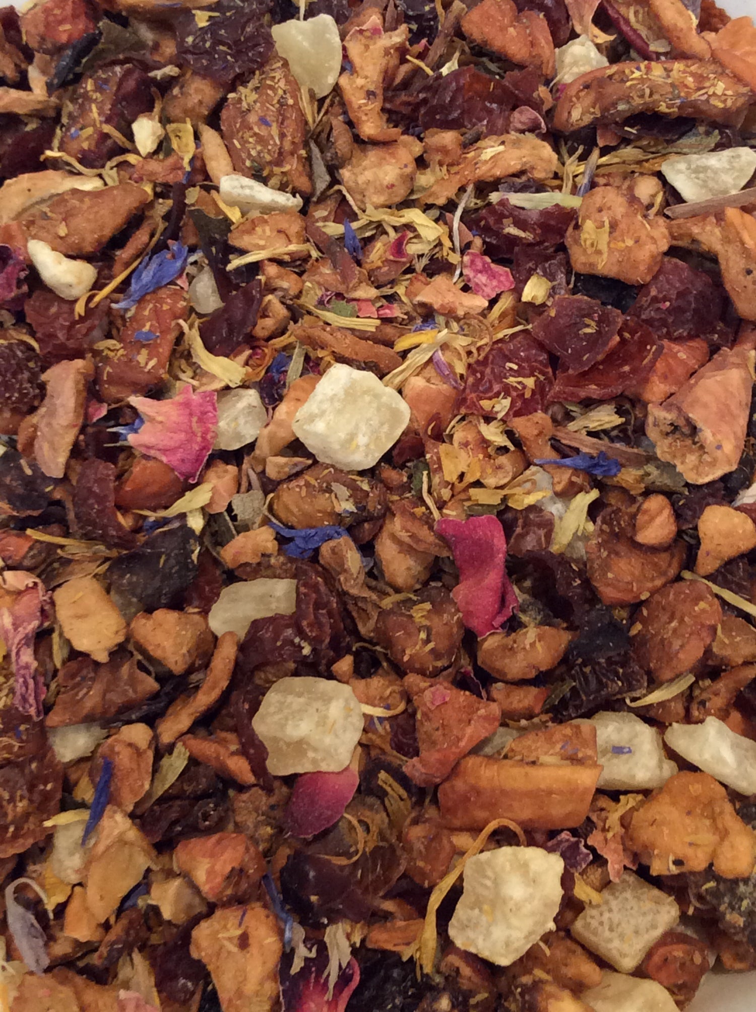 White peach Ingredients: Apple pieces, pineapple pieces, rosehip peel, peach pieces, marigold, rose blossoms, lemon myrtle, cornflower blossoms.