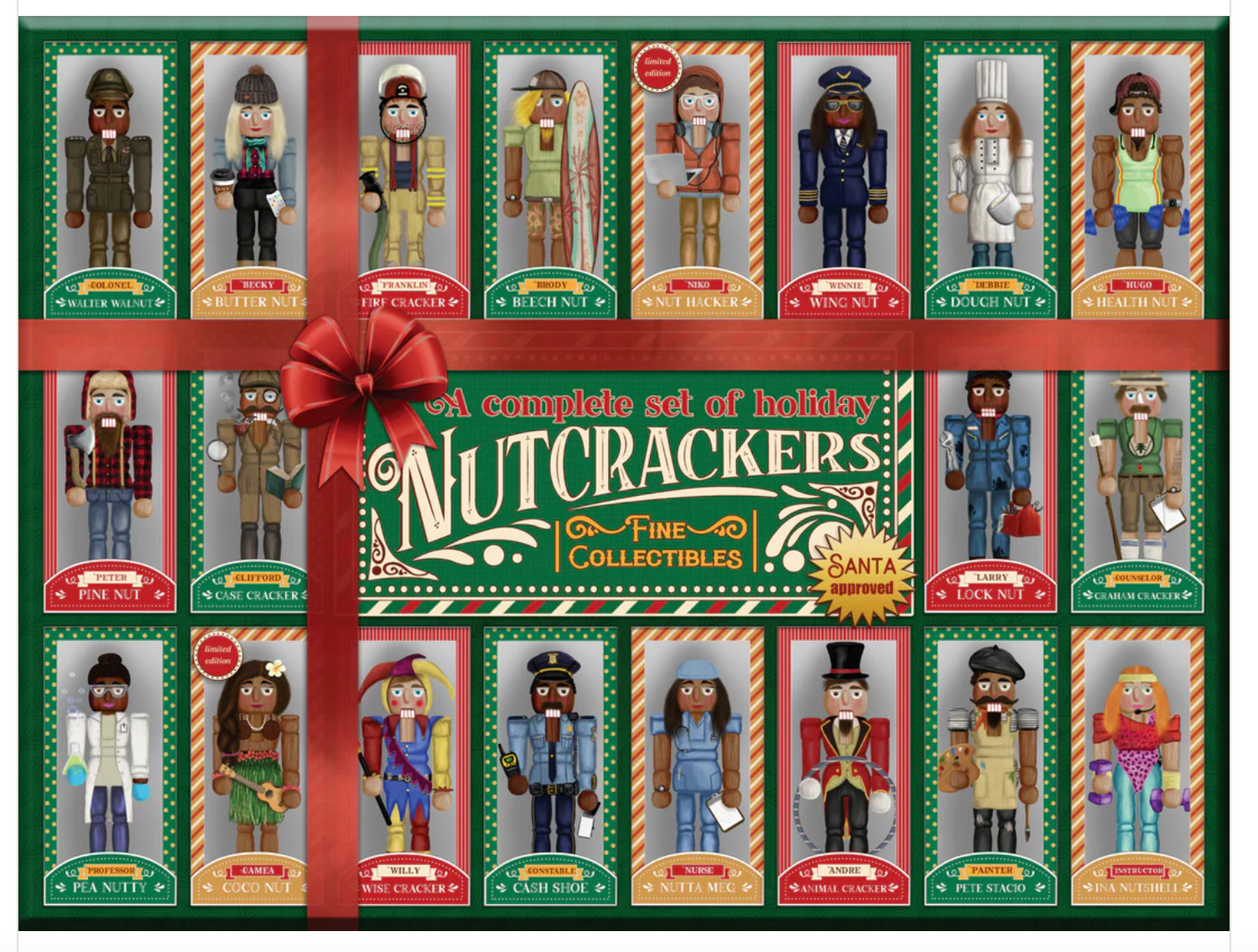 Find holiday cheer with this holly jolly nutcracker collection designed by artist Connie Resch! This colorful puzzle brings together unique characters that look an awful lot like people you may have seen before.