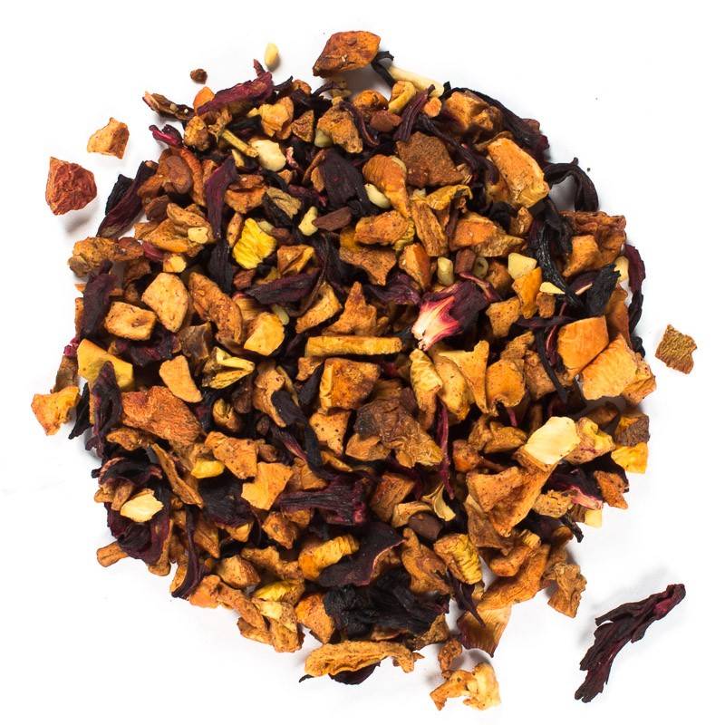 Apple pieces, hibiscus, almond pieces, cinnamon pieces, aromas