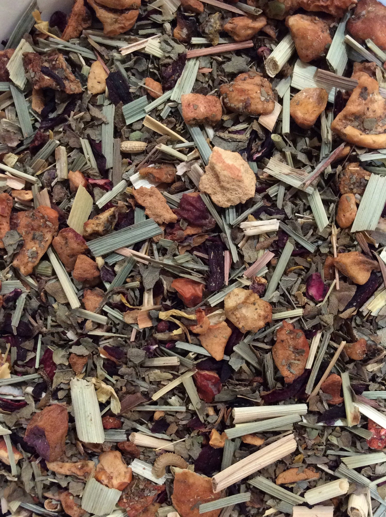 Ingredients: Apple pieces * (35%), basil * (19%), lemongrass * (16%), hibiscus *, strawberry pieces * (9%), natural flavor, marigold blossoms *, marjoram *