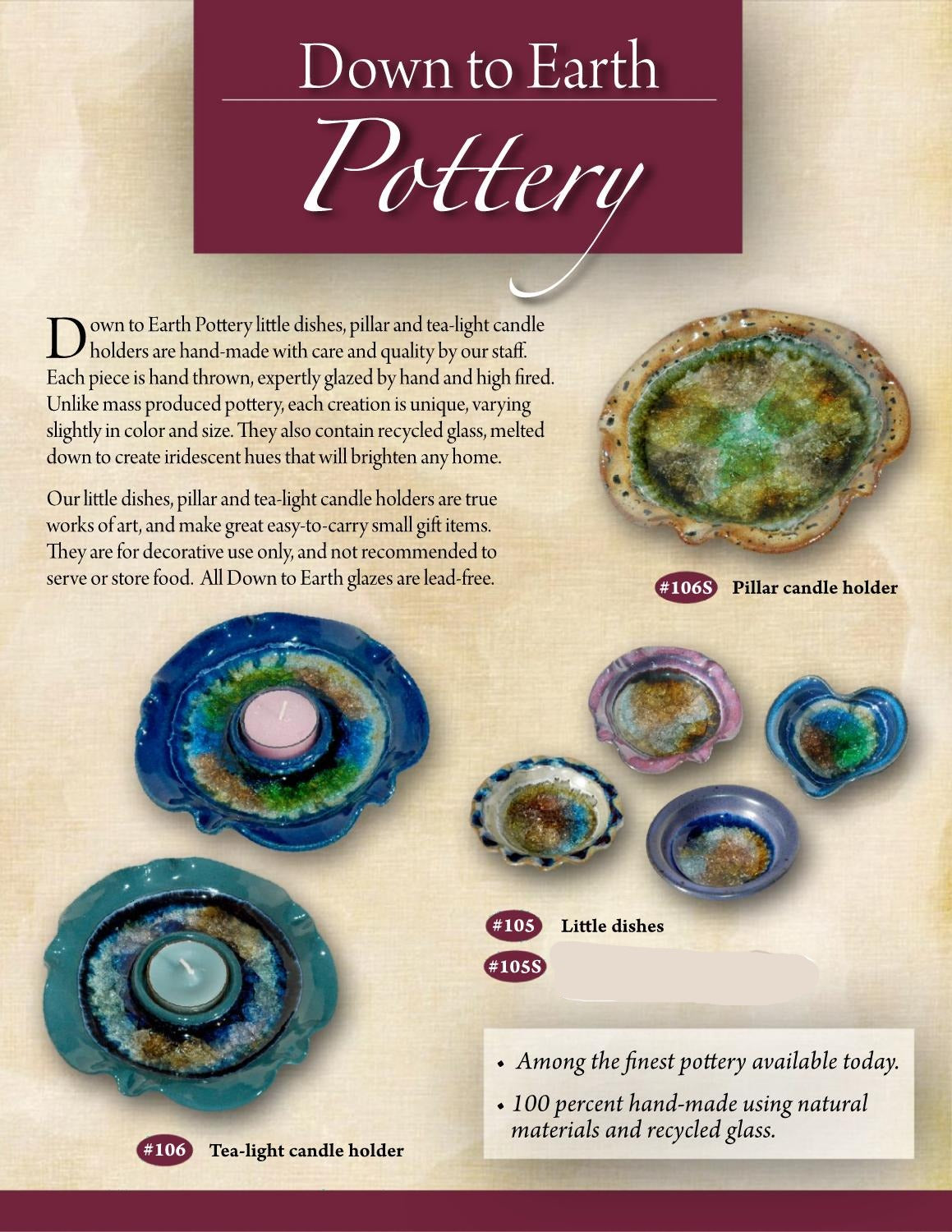 Unlike mass produced pottery, each creation is unique, varying slightly in color and size. They also contain recycled glass, melted down to create iridesent hues that will brighten any home. Our Pottery is a true work of art, and make great easy-to-carry heartfelt small gift items.